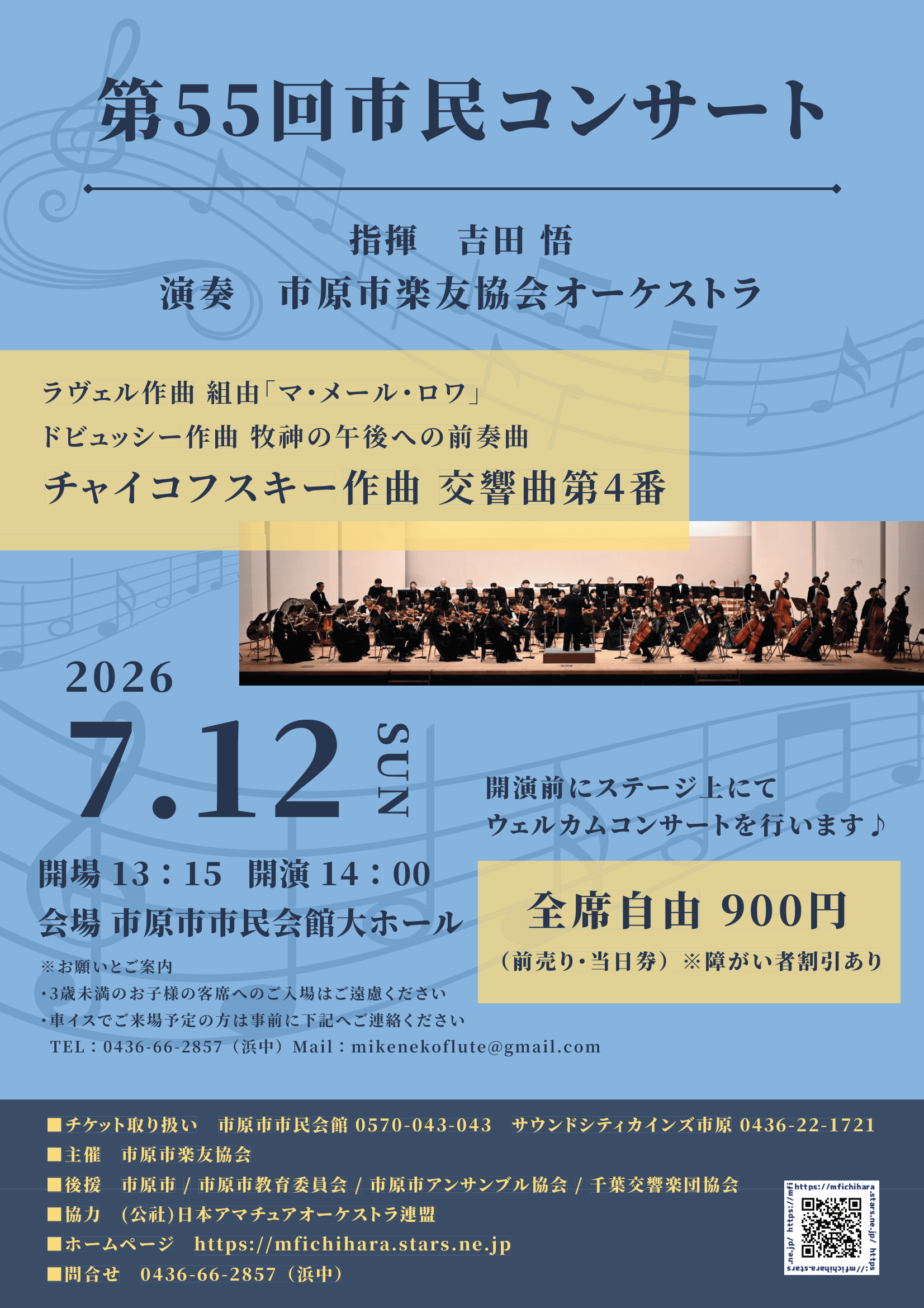 第55回 市民コンサート ![]() 日時:2026年7月12日(日) 14時開演(13時15分開場) 場所:市原市市民会館 大ホール 入場料:900円(全席自由) 指揮:吉田 悟 《曲 目》 ラヴェル/組曲「マ・メール・ロワ」 ドビュッシー/牧神の午後への前奏曲 チャイコフスキー/交響曲第4番 ※開演前にステージにて、ウェルカムコンサートを行います♪ |